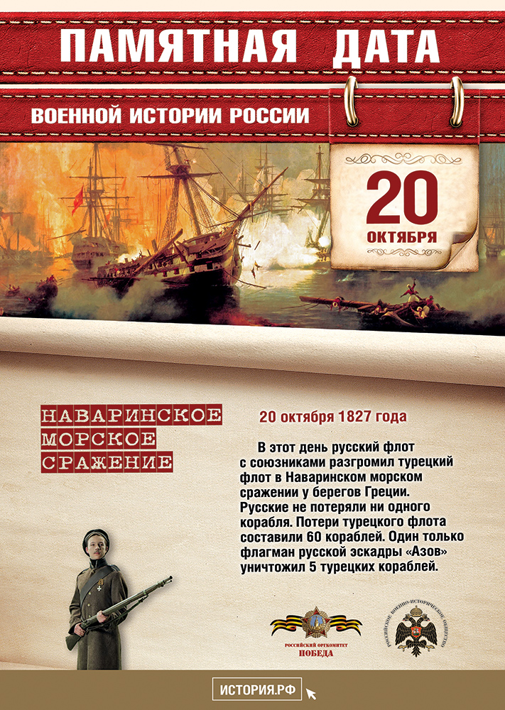 В этот день в 1827 году русский флот с союзниками разгромил турецкий флот в Наваринском сражении у берегов Греции. Русские не потеряли ни одного корабля. Потери турецкого флота составили 60 кораблей. Один только флагман русской эскадры «Азов» уничтожил 5 турецких кораблей.