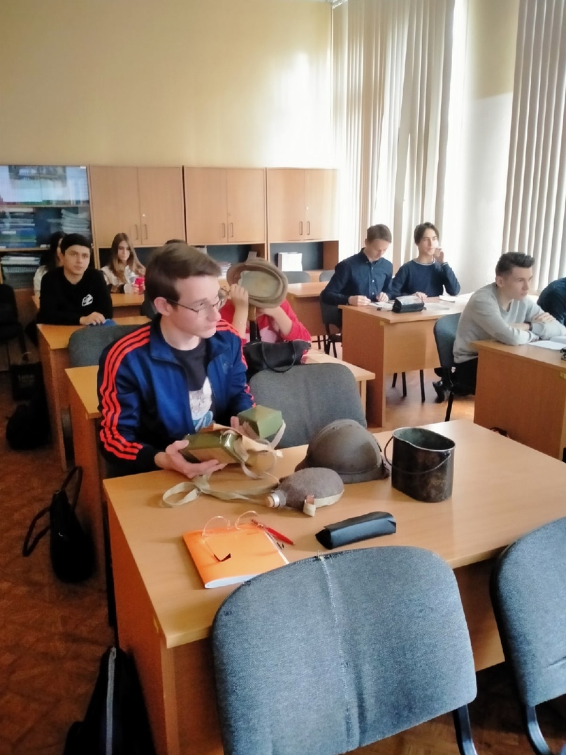 Также студентам были представлены подлинные вещи и аутентичные копии, которые носили и которыми пользовались солдаты и офицеры Русской Императорской армии: фуражка, французская каска, папаха, гимнастерка, противогаз Зелинского, медный котелок, ложка и другие предметы, необходимые воинам в походе. Это дало студентом возможность погрузиться в историю, узнать технологию и особенности изготовления снаряжения столетней давности.