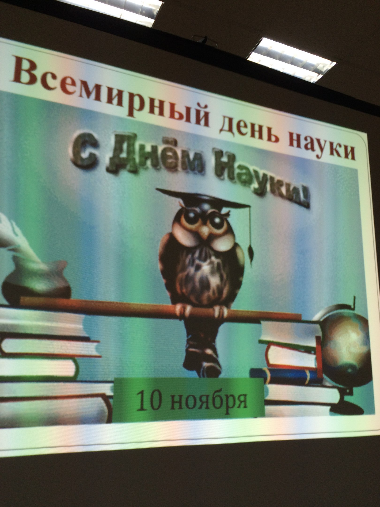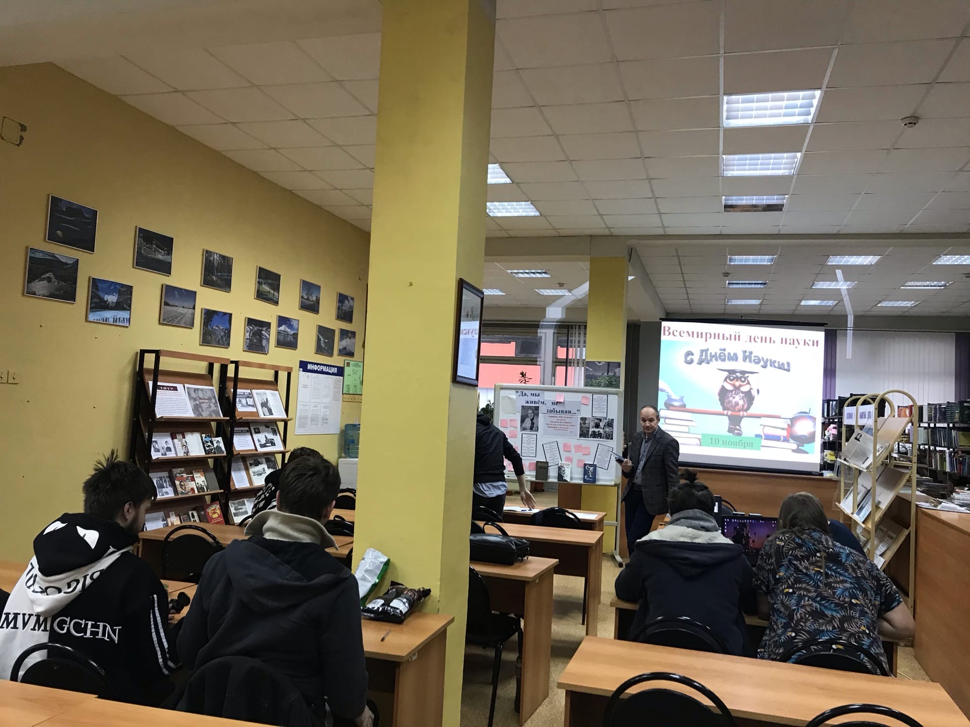 11-12 ноября 2020 года студенты групп 29ИНФ-11 и АП3 - 1 под руководством преподавателя Ильина С.В. присутствовали на уроке, подготовленном Косачевой М.В. и Корниенко Г.П. Встречу посвятили Всемирному дню науки. Он был учрежден в 2001 году ЮНЕСКО, отмечается мировым сообществом 10 ноября. Создан этот праздник науки и знаний для того, чтобы напомнить нам о важности науки и труда людей, которые ею занимаются. Россия – родина многих известных ученых, собравшиеся вспомнили великие имена: М. В. Ломоносов - основоположник отечественной науки, Н.И. Лобачевский, Д.И. Менделеев «Труд есть радость и полнота жизни», С.В. Ковалевская, Н.И. Пирогов, И.П. Павлов, С.П. Королев, Е.В. Касперский и др.